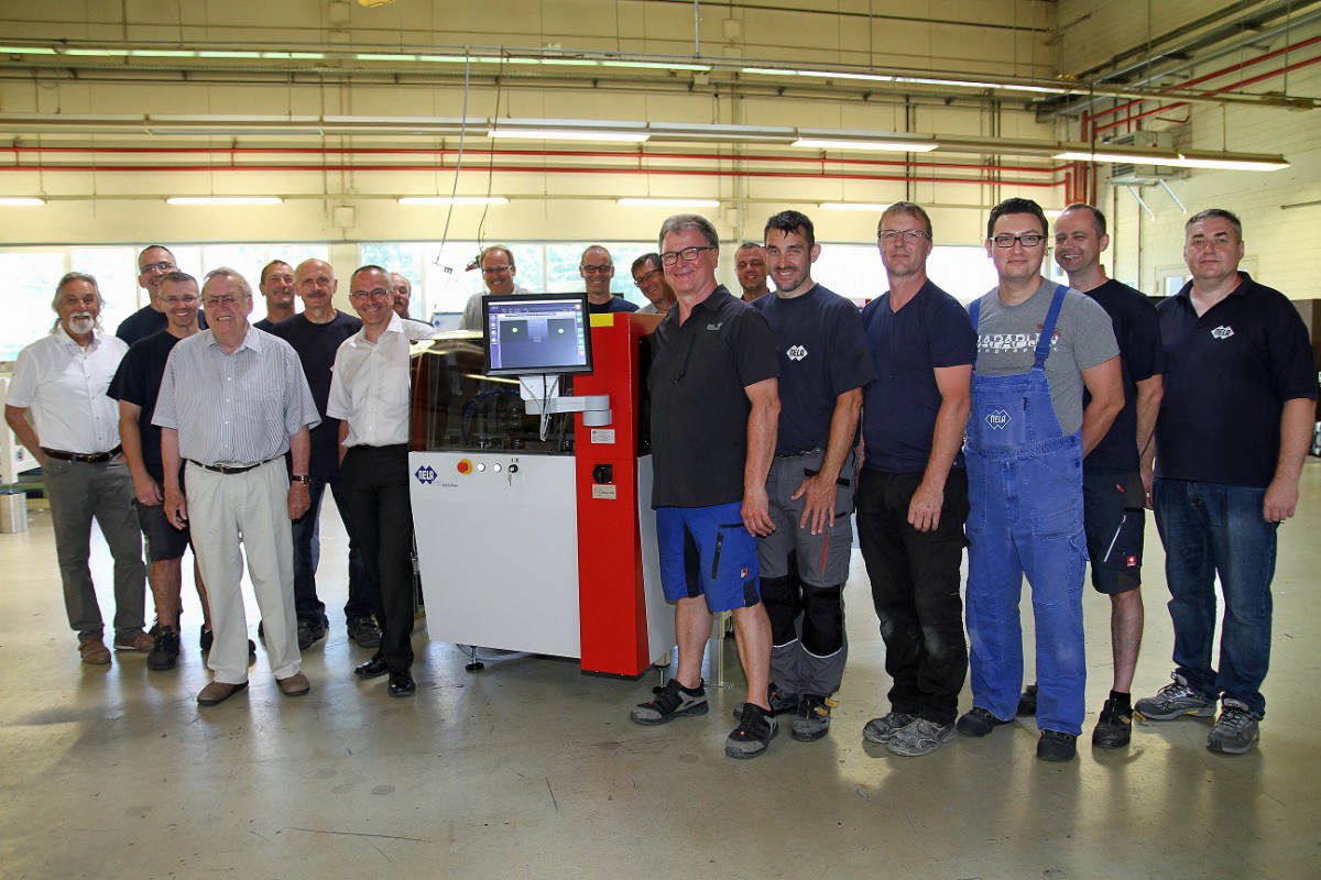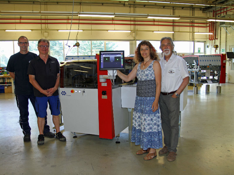 The creative team that developed the first NELA vision punch/bender. L.t.r.: Richard Foßler, Günther Roth, Claudia Künstle, as well as NELA's former Engineering and Sales Manager Helmut Britsch